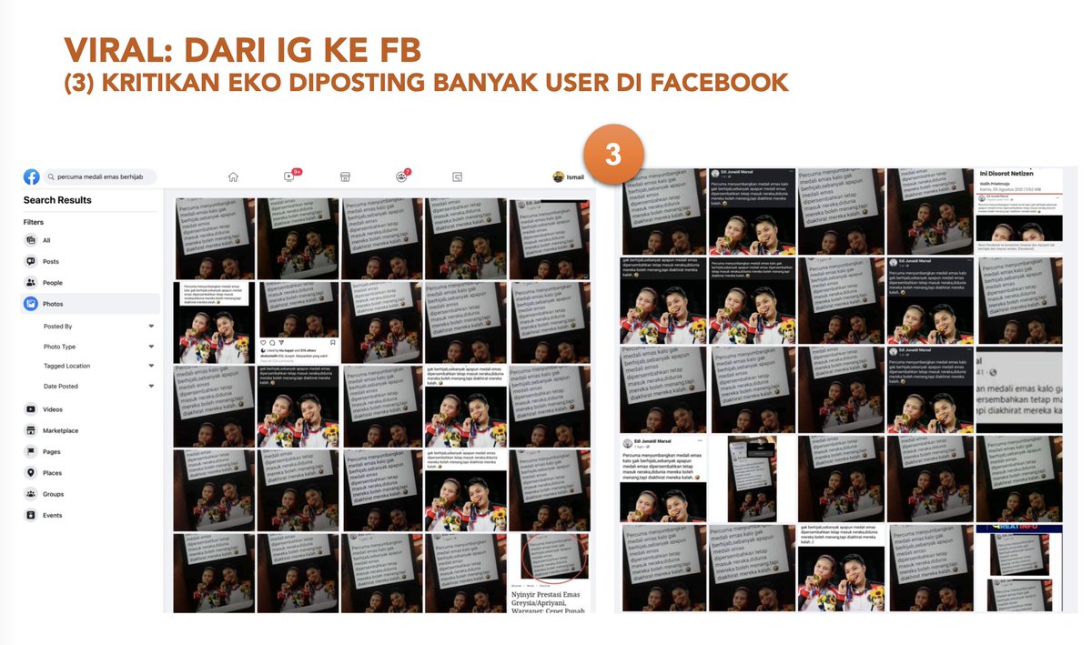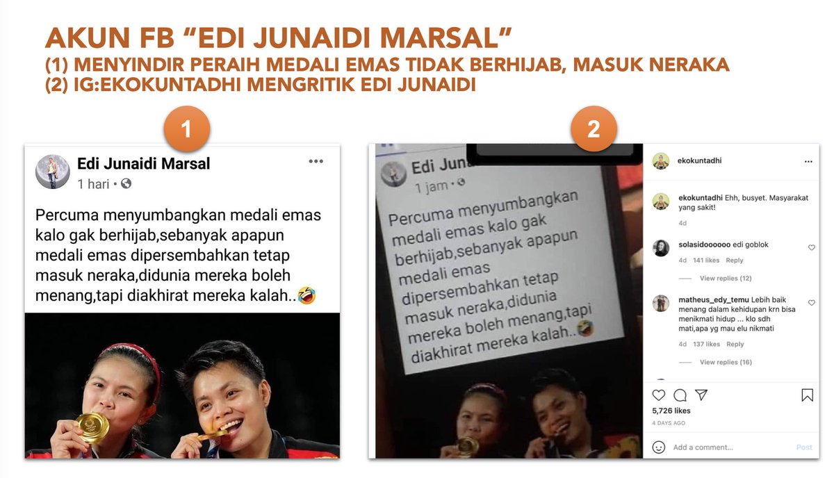 Di Facebook, ada akun "EJM": (1) EJM menyindir peraih medali emas kalau tidak berjilbab, sebanyak apapun, akan masuk neraka. (2) Di Instagram, EK mengritik cuitan EJM: contoh masyarakat yang sakit.