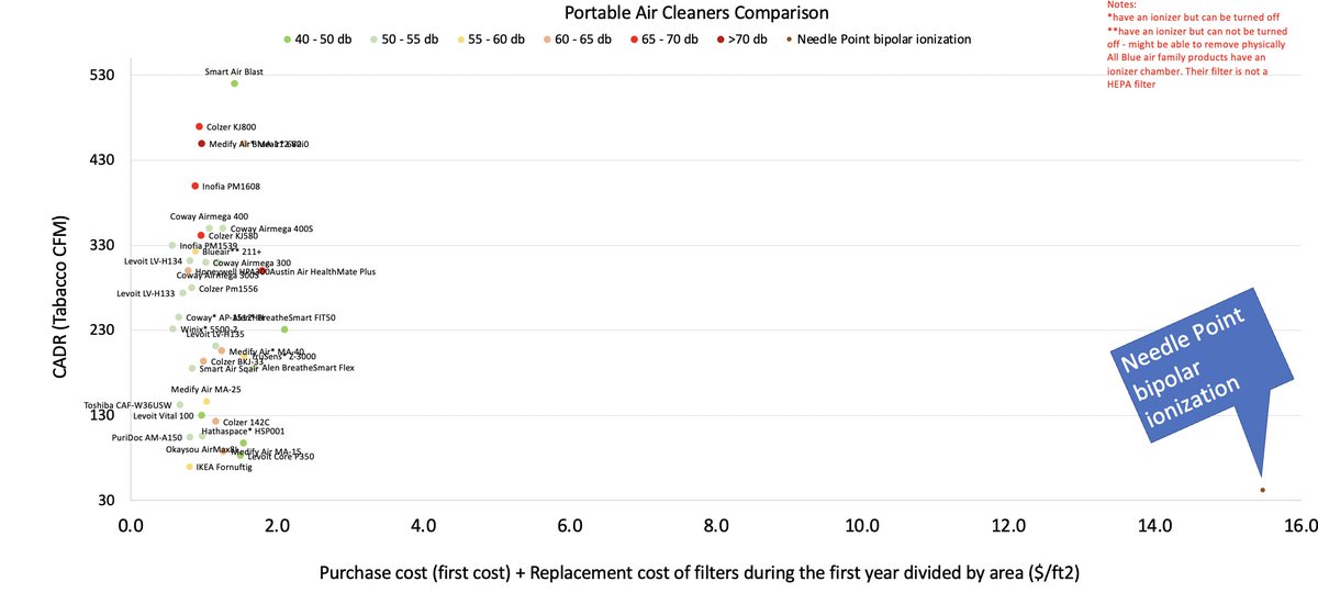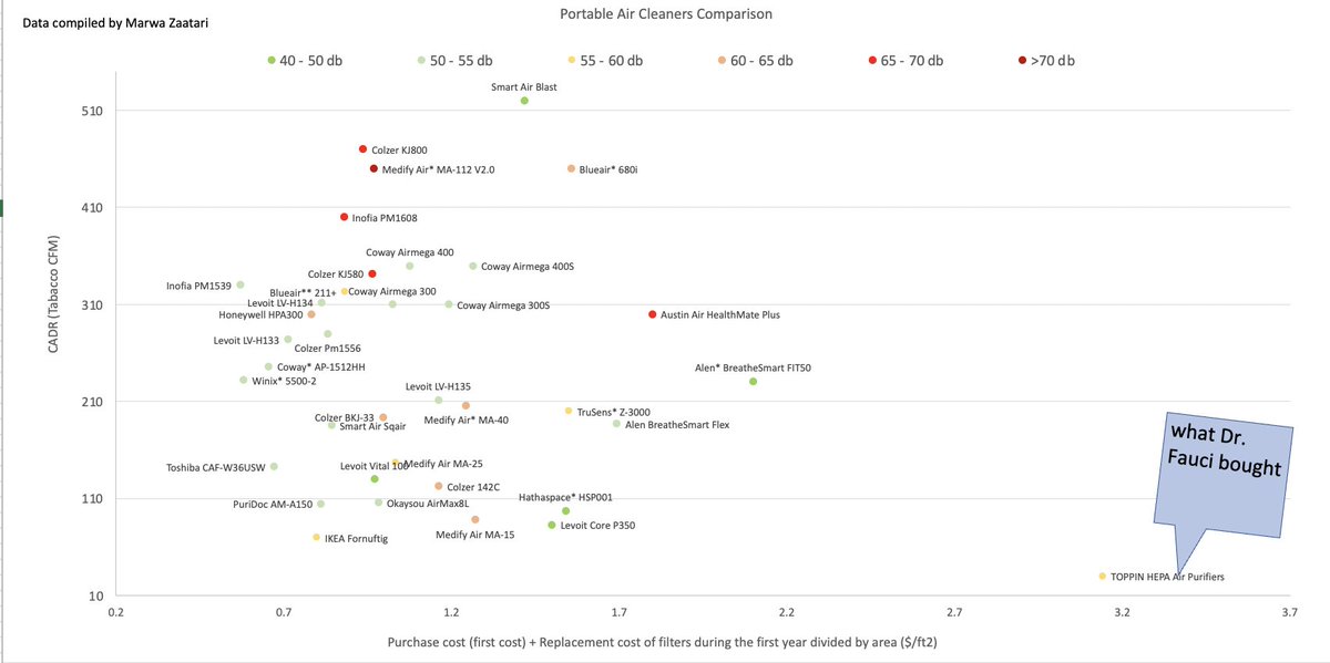 Don’t make the mistake of Dr. Fauci, make sure you are getting enough clean air for what you are paying for (expressed by x-axis $/ft2). You want high CADR with low cost and low noise.