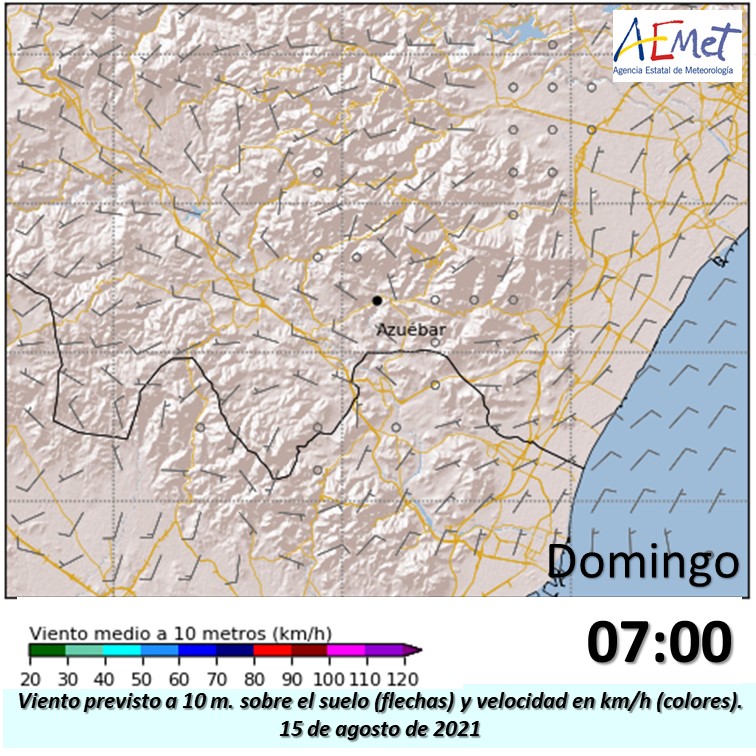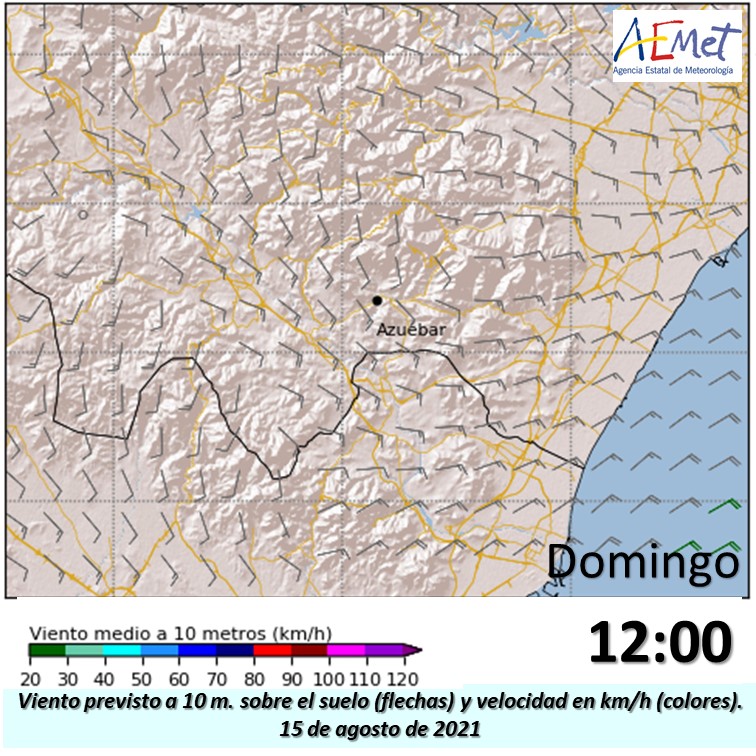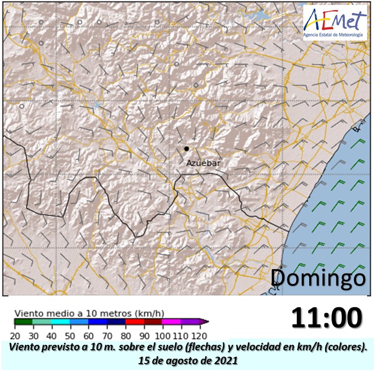 La previsión es que a lo largo de la mañana el viento vaya girando a brisa, en la zona del #IFAzuébar, más fresca y húmeda. Viento previsto a las 10, 11 y 12.