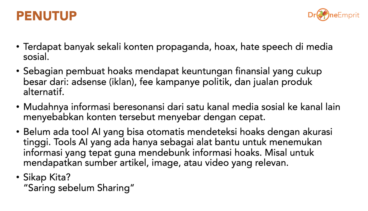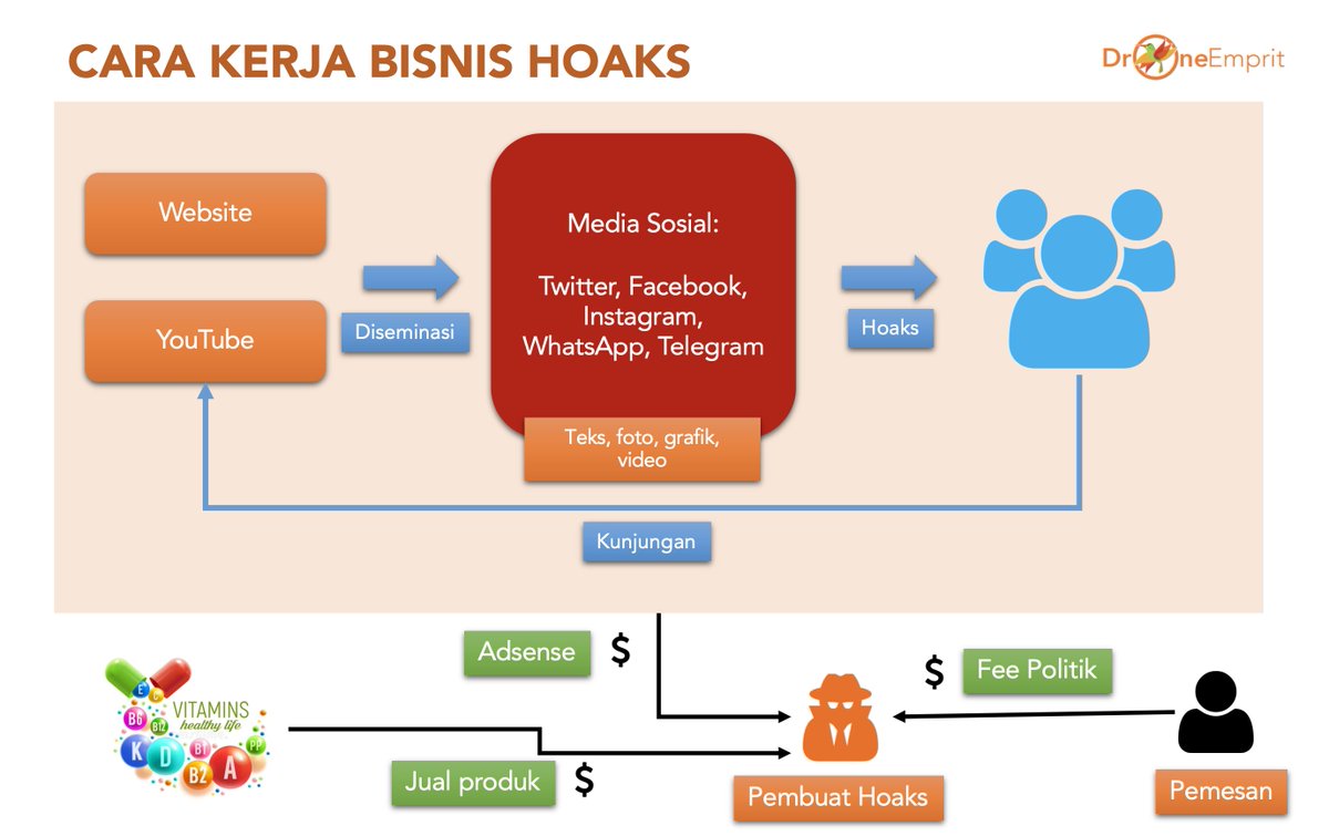 Yang di posisi bawah piramida, mengambil remah-remah keuntungan ekonomi dengan membuat hoaks demi adsense, jasa pesanan kampanye politik, atau jualan produk.