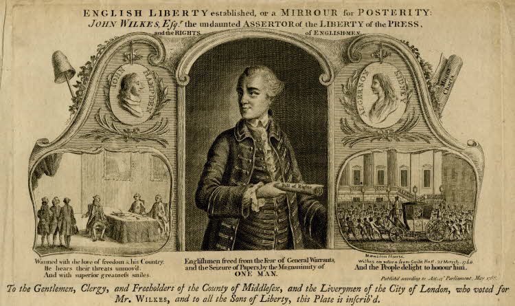 In 1763 Wilkes published a satirical pamphlet called ‘The North Briton’. His attacks on the Government in that publication, particularly in the 45th edition, led to his arrest under a general warrant. In January 1764 Wilkes was expelled from the House of Commons. [2/4]