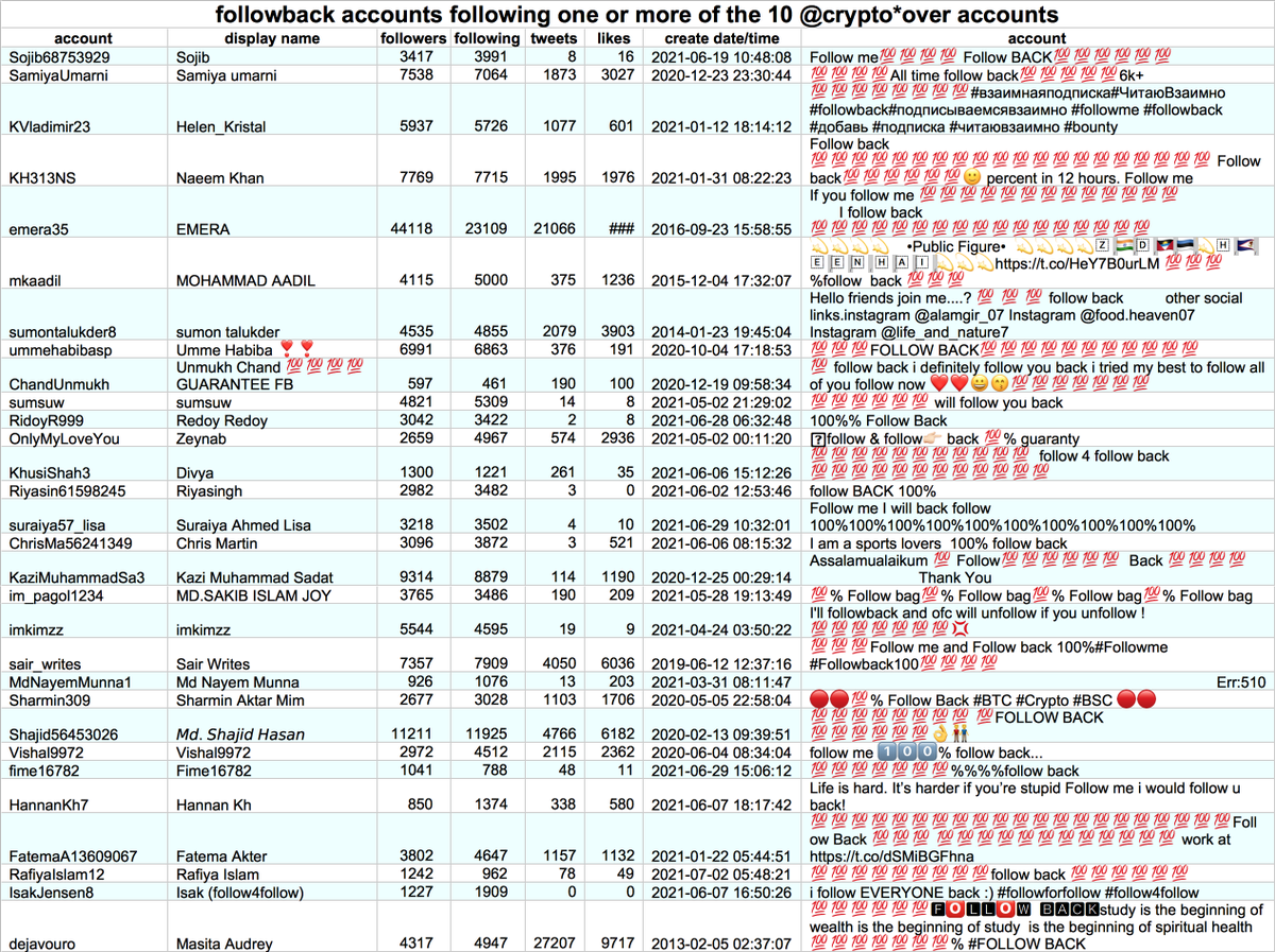 4022 of the accounts following one or more of the ten crypto*over1111 accounts are "followback" accounts - accounts that advertise in their profiles that they will follow any account back. This table shows some examples: