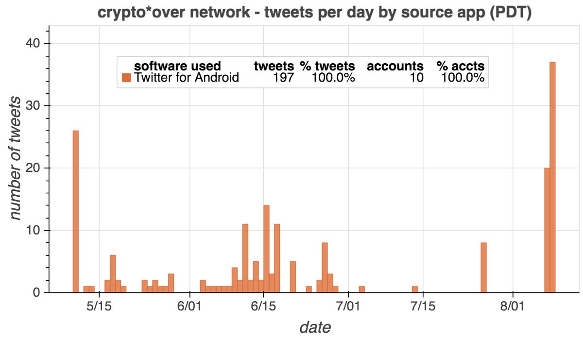 In addition to the eight accounts presently up for sale, we found two others with the same naming scheme: @cryptotover1111 and @cryptouover1111. All ten accounts were created in 2021 and have tweeted/retweeted a small amount of cryptocurrency content via Twitter for Android.