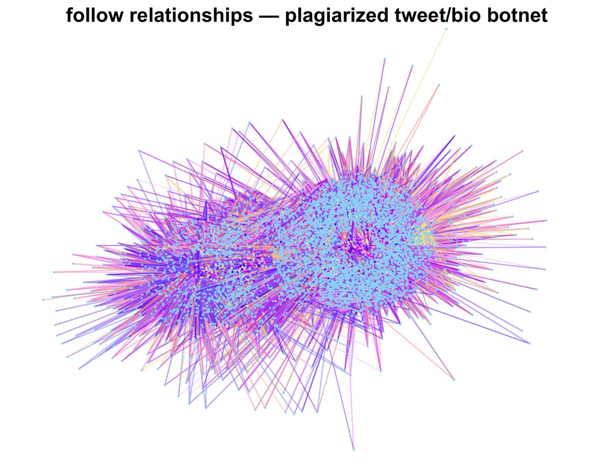 89 of the most recent followers of @cryptoaover1111 and its nine similarly-named friends are part of a much larger botnet whose members (so far) mostly follow one another. (The plagiarism mentioned in the graph title is explained further down the thread.)
