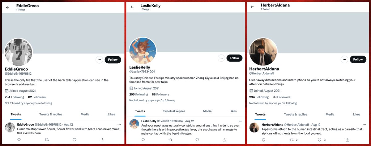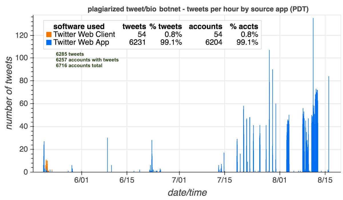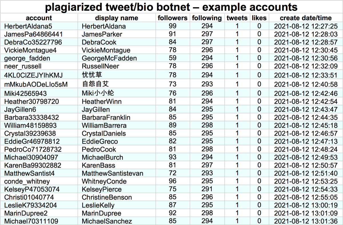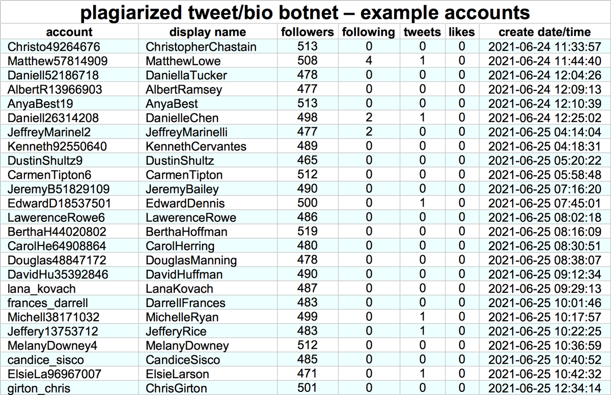 This botnet consists of 6716 accounts created in batches between May and August 2021. Most have tweeted exactly once, although some have no tweets and a few have up to five. None has ever liked a tweet, and all follow hundreds or thousands of other members of the botnet.