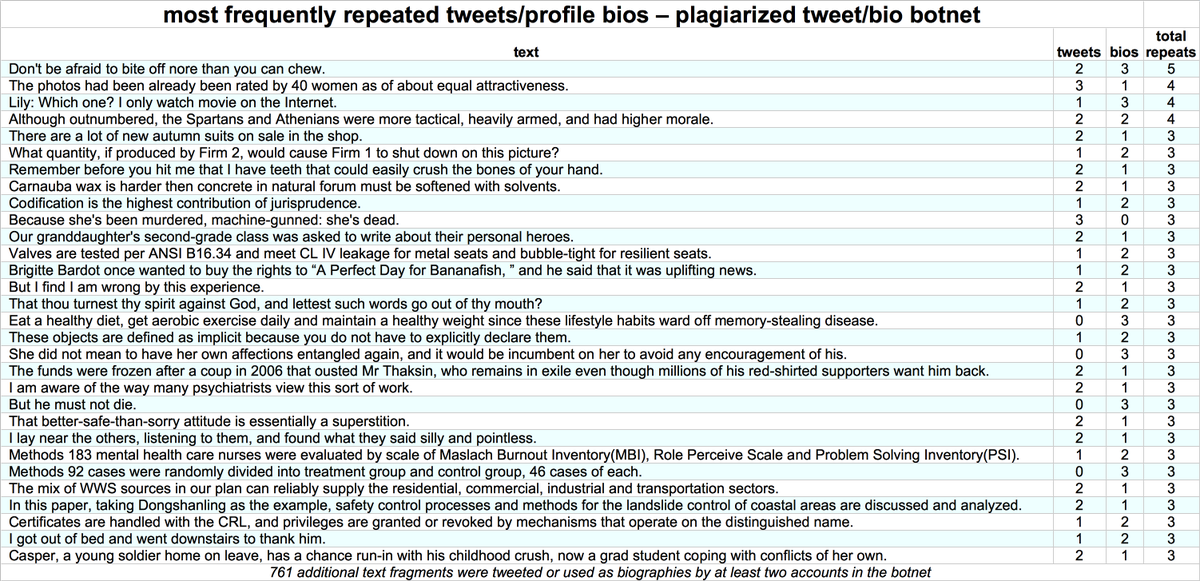 The accounts in this fake follower network use a variety of repeated or otherwise formulaic biographies, some of which are repeated dozens or hundred of times. Some of the biographies begin with unnecessary leading commas, and a few consist entirely of punctuation.