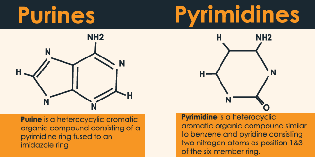 2/ The nucleic acids are of 5 types with Adenine, Guanine, Cytosine, Thymine and Uracil. They are dividend in purines with Adenine and Guanine. The purines have 2 rings. The pyrimidines are made up of Uracil, Thymine and Cytosine and have 1 ring.