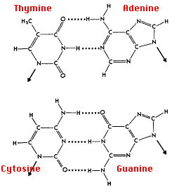 3/ Four of them are used in DNA with Adenine (A), Guanine (G), Cytosine (C), and Thymine (T). The are base paired together into A-T and G-C. The A is always with a T and the G is always with a C. The A-T pair shares 2 hydrogen bonds while the G-C pair shares 3 hydrogen bonds.