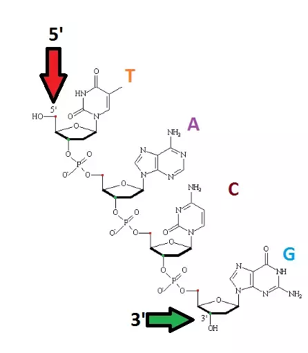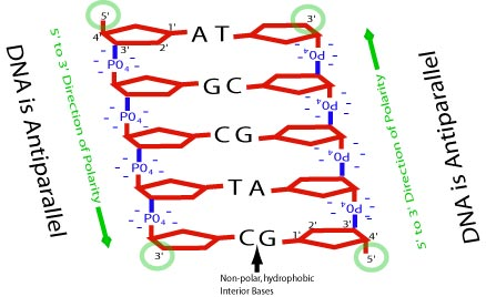 8/ The DNA is double stranded with both strands running in opposite directions called antiparallel. This means one strand runs 5' to 3' and the other runs the exact opposite of 3' to 5'.