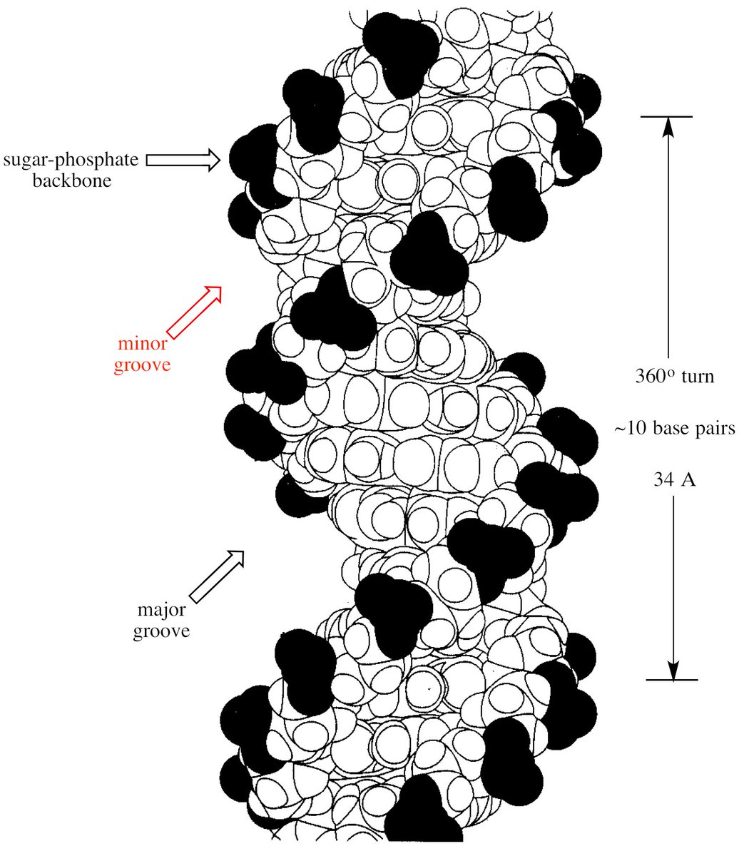 12/ Each twist of the helix is about 10 base pairs in length.