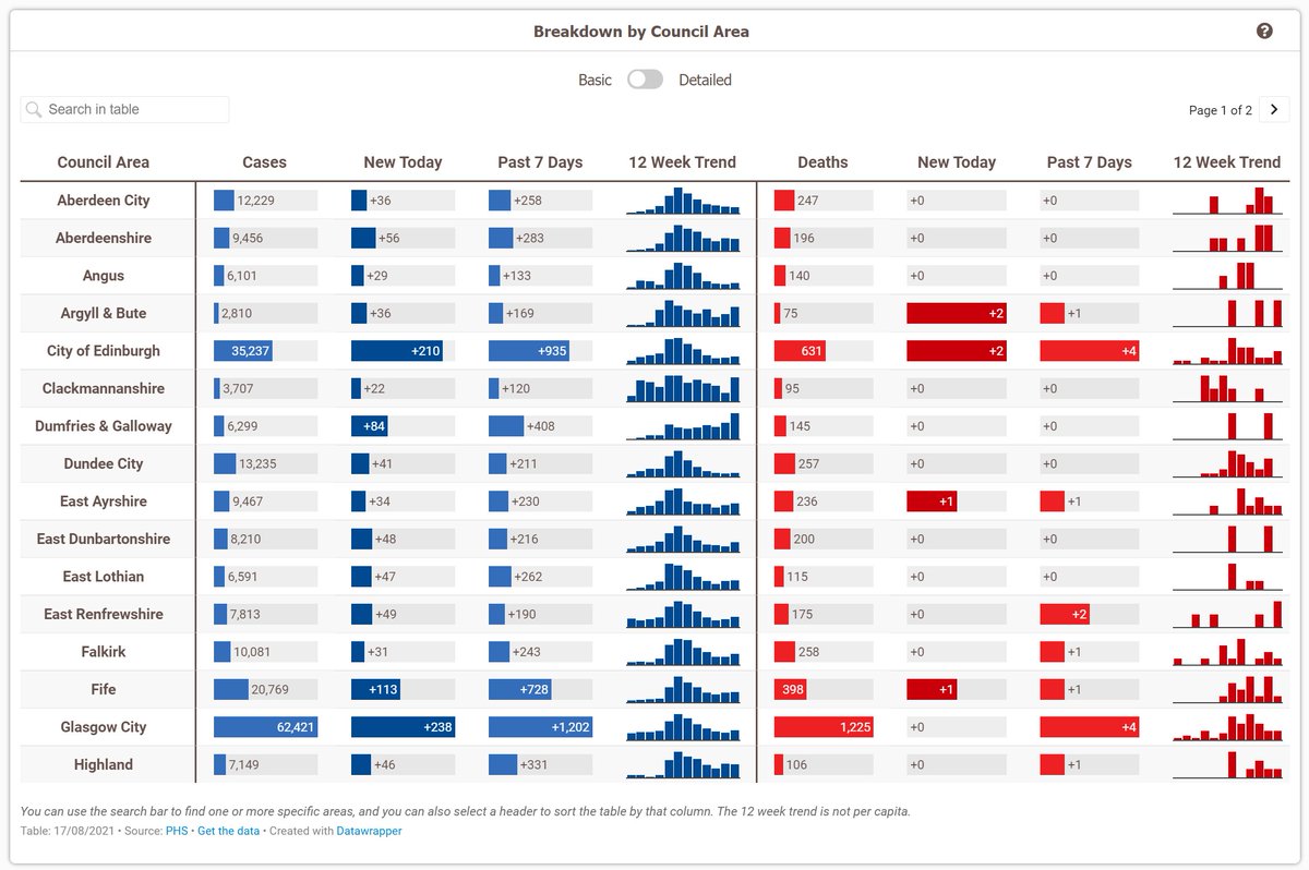 And then the 20 day trends on the basic council area table are now a 12 week trend, showing the total number of cases/deaths each week for the past 12 weeks