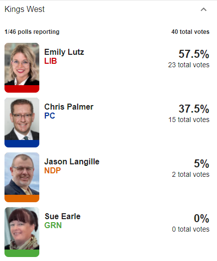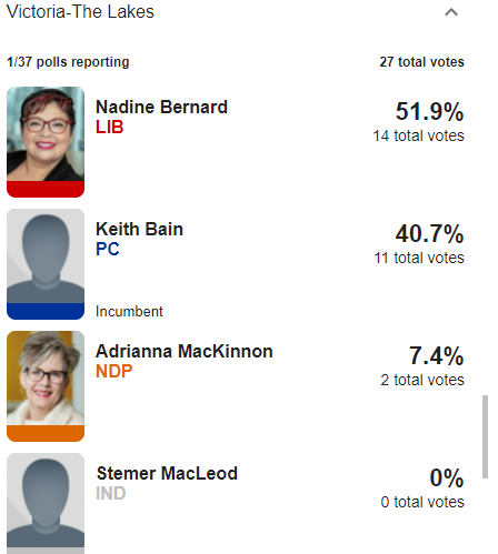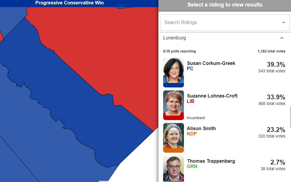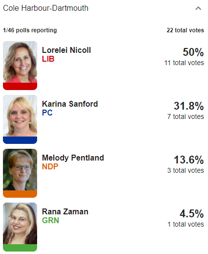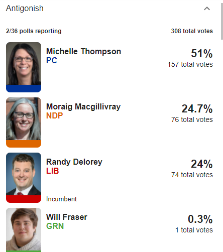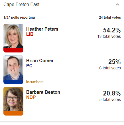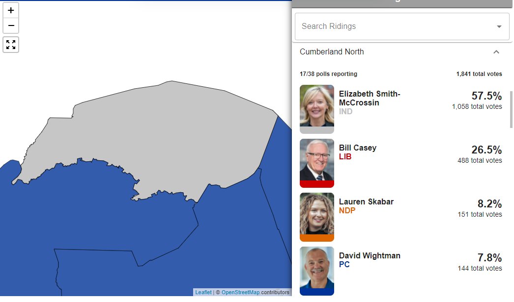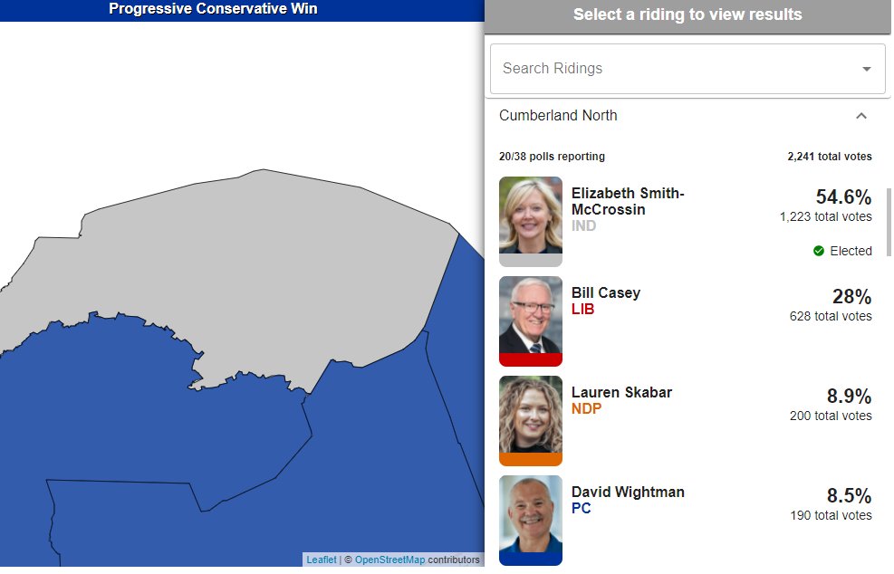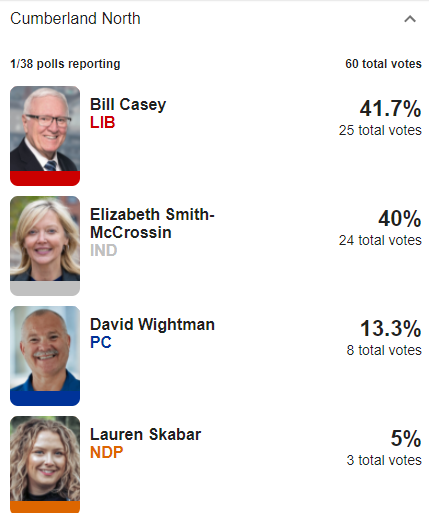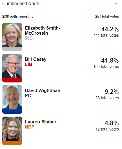 First results are in for Cumberland North, which we're expecting to be tight. Liberal Bill Casey leading by one vote over former PC Elizabeth Smith-McCrossin