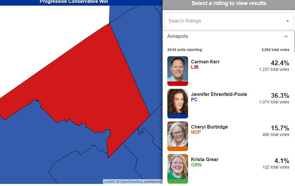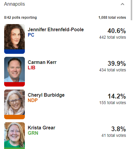 Jennifer Ehrenfeld-Poole, the PC who came under fire for previous social media posts early in the campaign, currently leading in Annapolis (Stephen McNeil's territory)