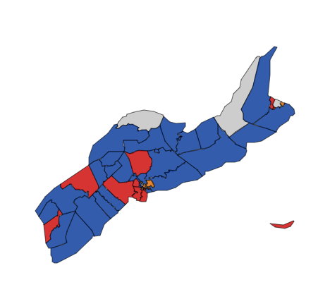 There are a few close ridings that is preventing the call of a PC majority government, including Clare, Yarmouth, Lunenburg and Chester-St. Margaret's.