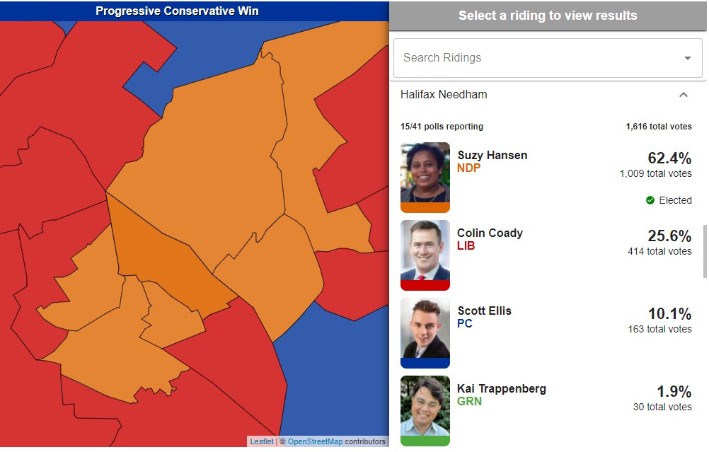 Halifax/Dartmouth looking fairly orange. Suzy Hansen with the win over Liberal Colin Coady