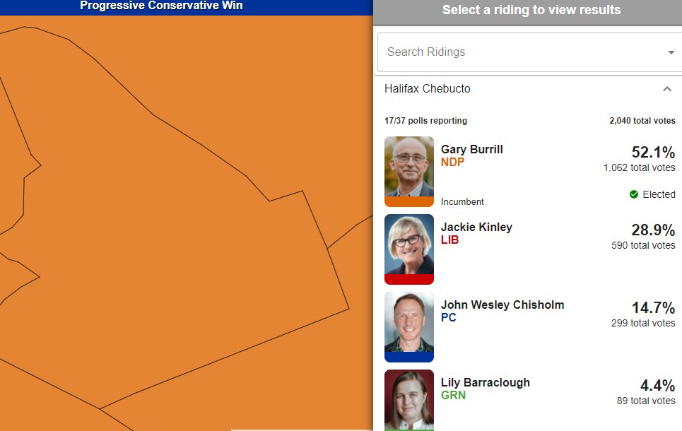 NDP Leader Gary Burrill has won back his seat in Halifax-Chebucto -- that's another orange win on the Halifax peninsula. @GaryBurrill