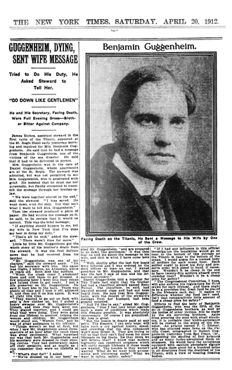 El senyor Guggenhein va dir els nens i les dones primer i va ajudar als oficials després es va vestir de nit i es va treure el salvavides, sabia quin seria el seu final