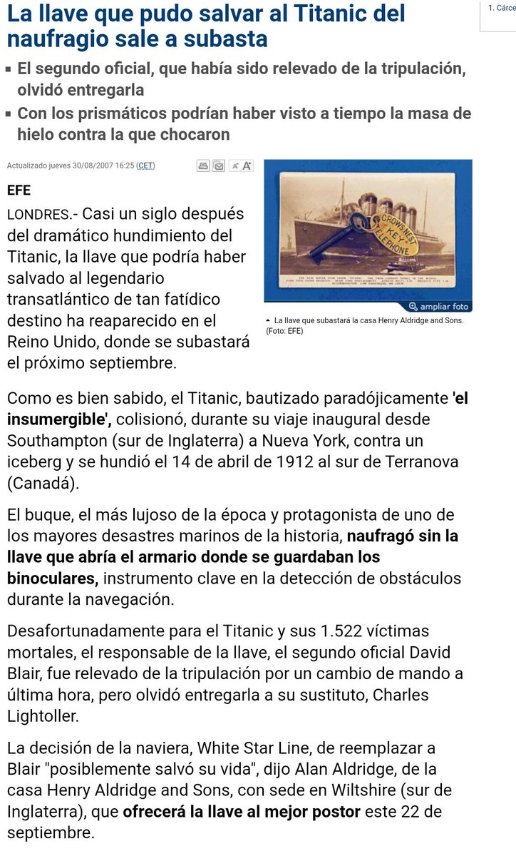 Tb a última hora va haver-hi un canvi de mando, i precisament el q portava la clau de l'armari on hi havia els binoculars q haguessin permès veure el iceberg i evitar l'accident quina mala sort!