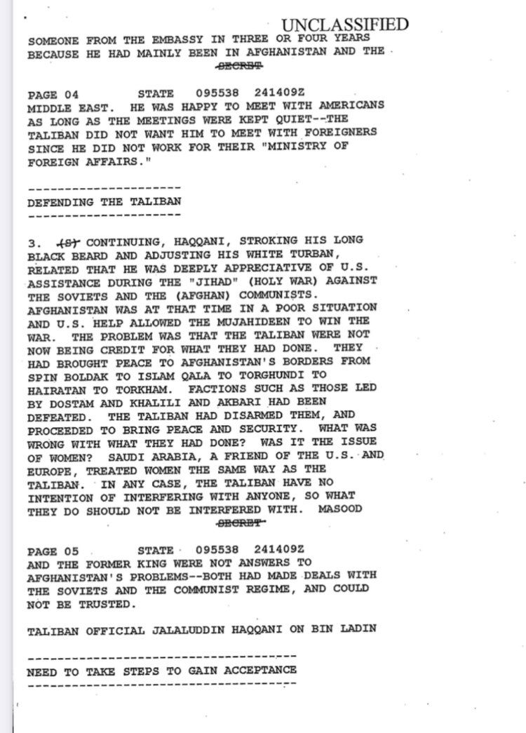 12. Here is Declassified cable on meeting between US civil servant and Jalaluddin Haqqani- “US help allowed the Mujahideen to defeat the Soviets” Note also: Haqqani says Saudi Arabia a US ally also treated women the same as the Taliban. Image