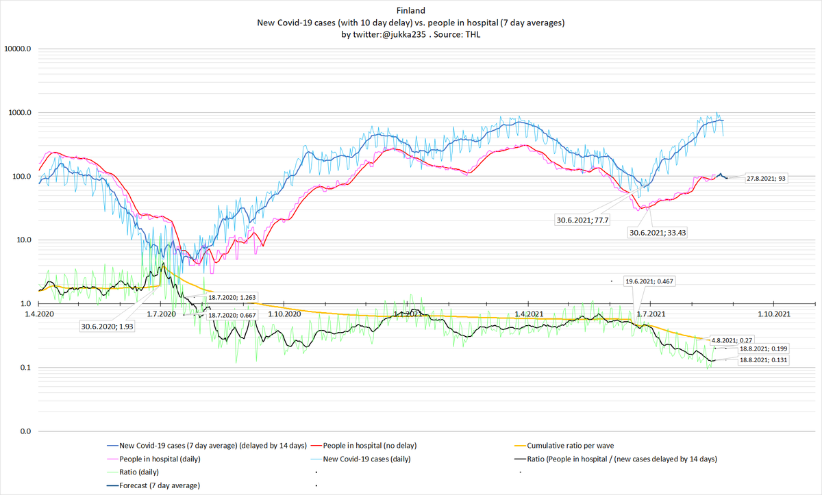 Tartuntojen määrä laskee. Tänään THL ilmoitti 866 tartuntaa, ei poistanut yhtään, ja otti tunnettua raportoinnin viivettä kiinni 147 tartunnan verran (ei siis 160). Yhteensä 866+0-147=719 (punainen viiva). 3/x