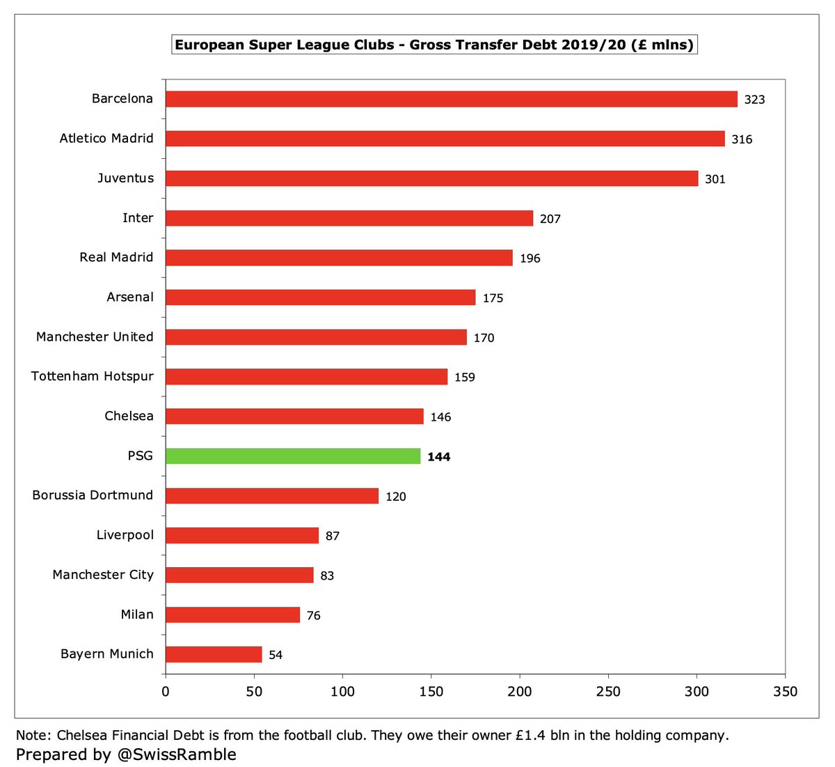 @SwissRamble 📌 PSG لا يملك أي دين خارجي، ولكن القرض من QSI زاد من 50m€ إلى 197m€ في 2020. أحد الأقل بين أندية النخبة في أوروبا.