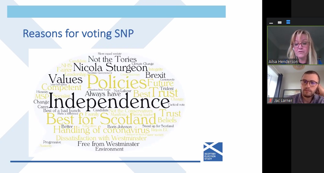 Here are reasons people from the study outlined for voting SNP. 'Who the SNP are not' is part of the story, as are their policies (often referred to as a whole rather than as specific pledges) and of course independence.