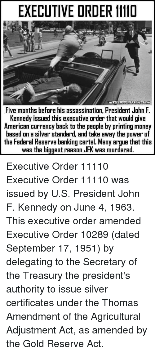 Els seus esforços per aconseguir que totes les tropes nord-americanes sortissin de Vietnam el 1965 combinades amb l’Ordre executiva 11110 haurien destruït els beneficis i el control del banc privat de la Reserva Federal.