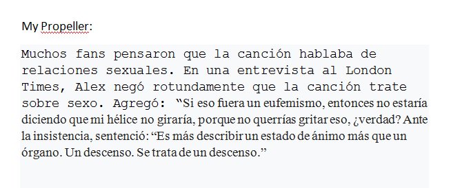La primera canción del álbum es "My Propeller". Acá la explicación de Alex sobre la letra de la canción, para responder a la polémica sobre si trataba de relaciones sexuales.