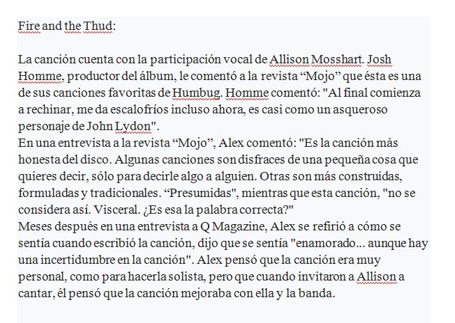 Tomando en cuenta todas las canciones y b-sides de Humbug, estas son las canciones que no fueron interpretadas en vivo ni en acústicos de Alex: