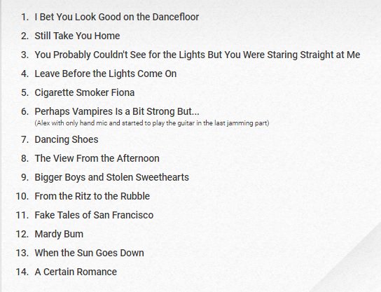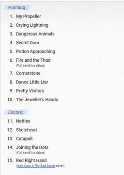 10. Brianstorm 11. Potion Approaching 12. Do I Wanna Know? 13. That's Where You're Wrong 14. Knee Socks 15. Pretty Visitors 16. From The Ritz To The Rubble 17. I Bet You Look Good On The Dancefloor 18. R U Mine?