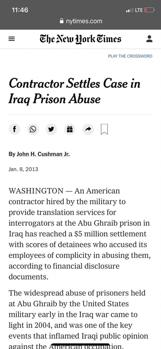 2013: Rochelle Walensky’s father’s Titan Corporation “either participated in, approved of, or condoned the mistreatment of prisoners by United States military officials.” Settles in Iraqi abuse case nytimes.com/2013/01/09/wor…