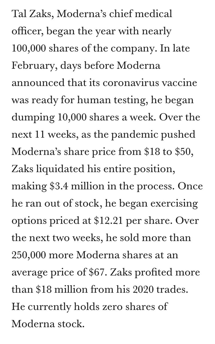 Tal Zaks began the year with nearly 100,000 shares of Moderna stock. In late February, days before Moderna announced that its coronavirus vaccine was ready for human testing, he began dumping 10,000 shares a week. He currently holds zero shares of Moderna stock. Profit $3.4 mil