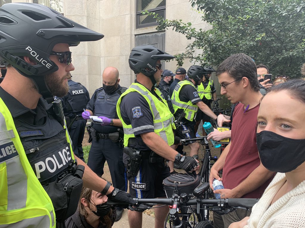 For context, these were the first protesters to show up. This was the very first time police started pushing them back. None of them are armed, and if you ask me, things seem pretty disorganized. (There is, however, one protester armed with a whistle)