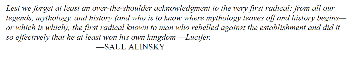 Before we delve into facts, a quote from someone who admired the devil. In the personal acknowledgments of his book "Rules for Radicals: A Practical Primer for Realistic Radicals", Saul Alinsky thanked "the very first radical ...that...won his own kingdom — Lucifer."