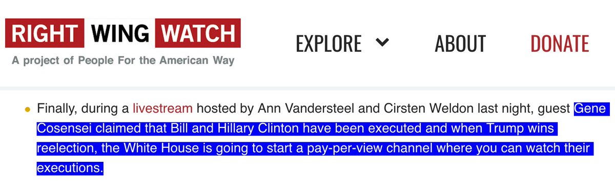 "GENE COSENSEI claimed that Bill and Hillary Clinton have been executed and when Trump wins reelection, the White House is going to start a pay-per-view channel where you can watch their executions."