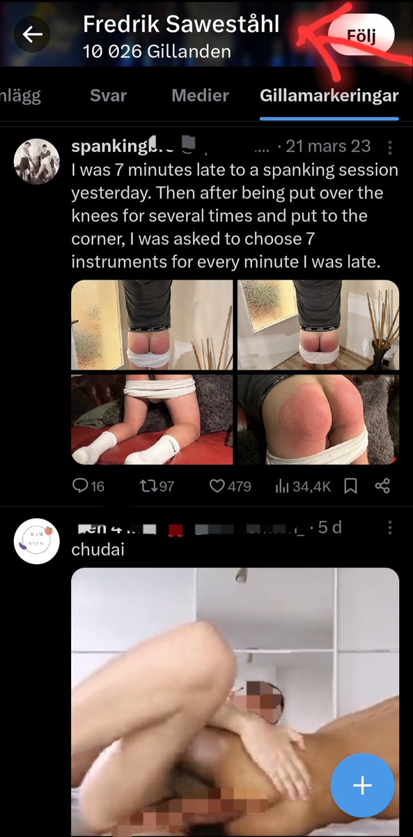 Det framgår av ett snabbt scrollande att den typ av porr som Saweståhl lajkar har fokus på BDSM och framförallt spanking.