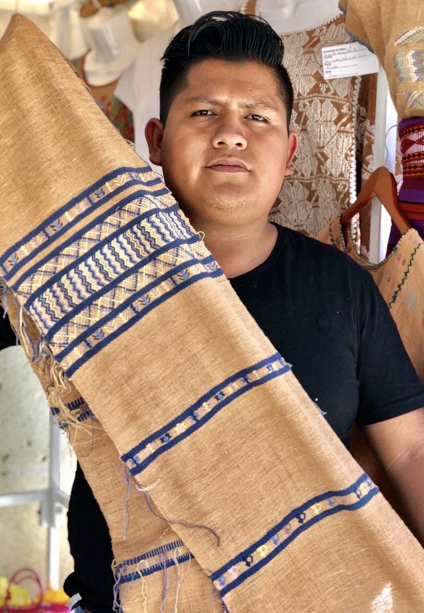Josué García García originario de San Baltazar Guelavila Oaxaca realiza textiles en telar de pedal con hilo de lana y algodon pigmento con tintes naturales y joyería en alambre y macramé .