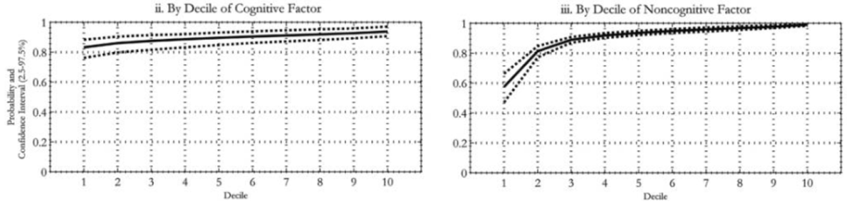 Las siguientes gráficas muestran la relación entre habilidades antes de los cinco años (partidas por deciles en el eje horizontal) y varios factores medidos en la adultez: