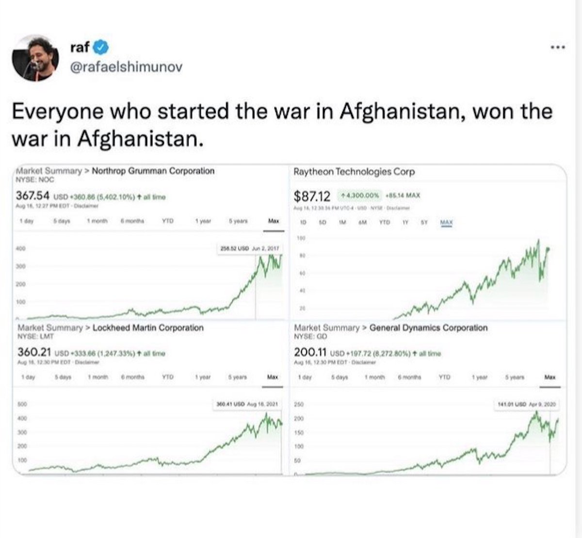 Ask always who created this mess, who benefits from it (diverting hundreds of billions of $$$ of taxpayer money to Military Industrial Complex, e.g. Lockheed Martin). Ask who pays the price (Afghan civilians & also American soldiers). [7/11]