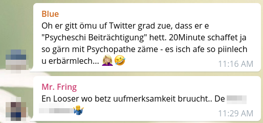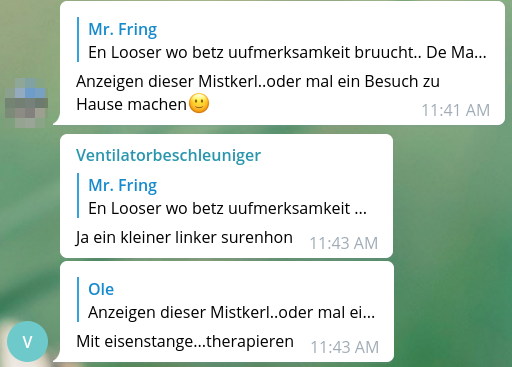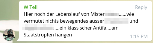 Das Opfer wird derweil in verschiedenen Telegram-Chats aufs Gröbste diffamiert. Sein Klarname wird munter herumgereicht, Fotos werden gepostet, teilweise sogar sein Lebenslauf.