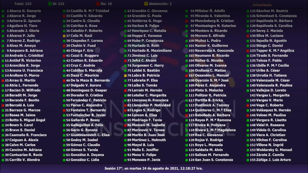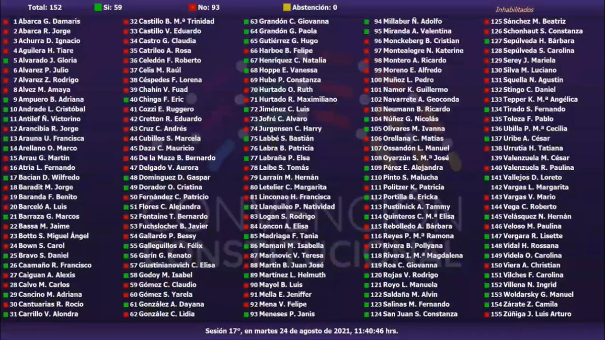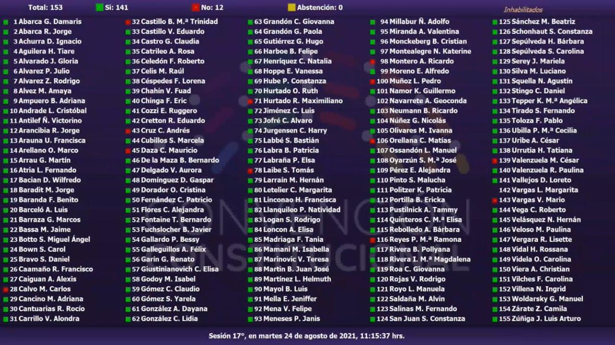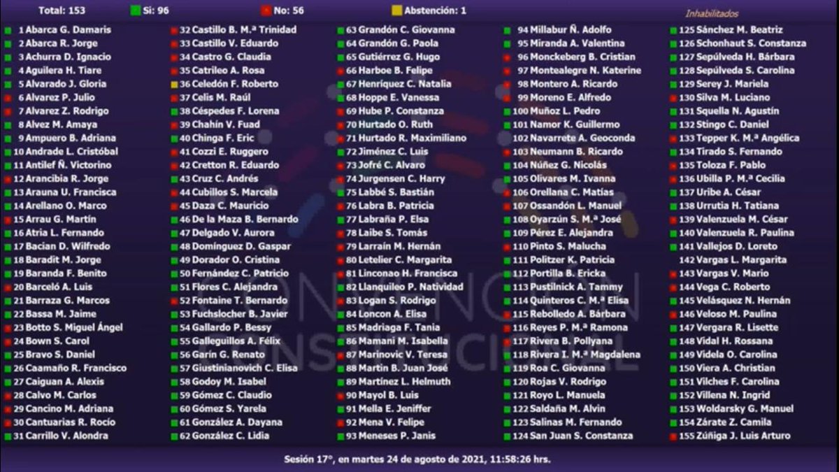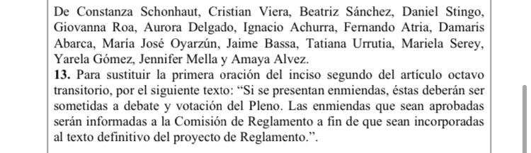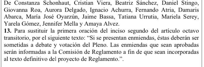 🗳️Votación enmienda nº11 para incorporar a continuación de la palabra “enmiendas”, la siguiente frase:“, las que deberán presentarse con el patrocinio de 30 constituyentes”.