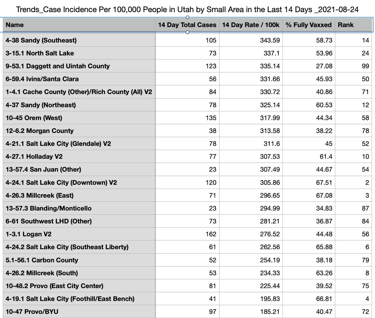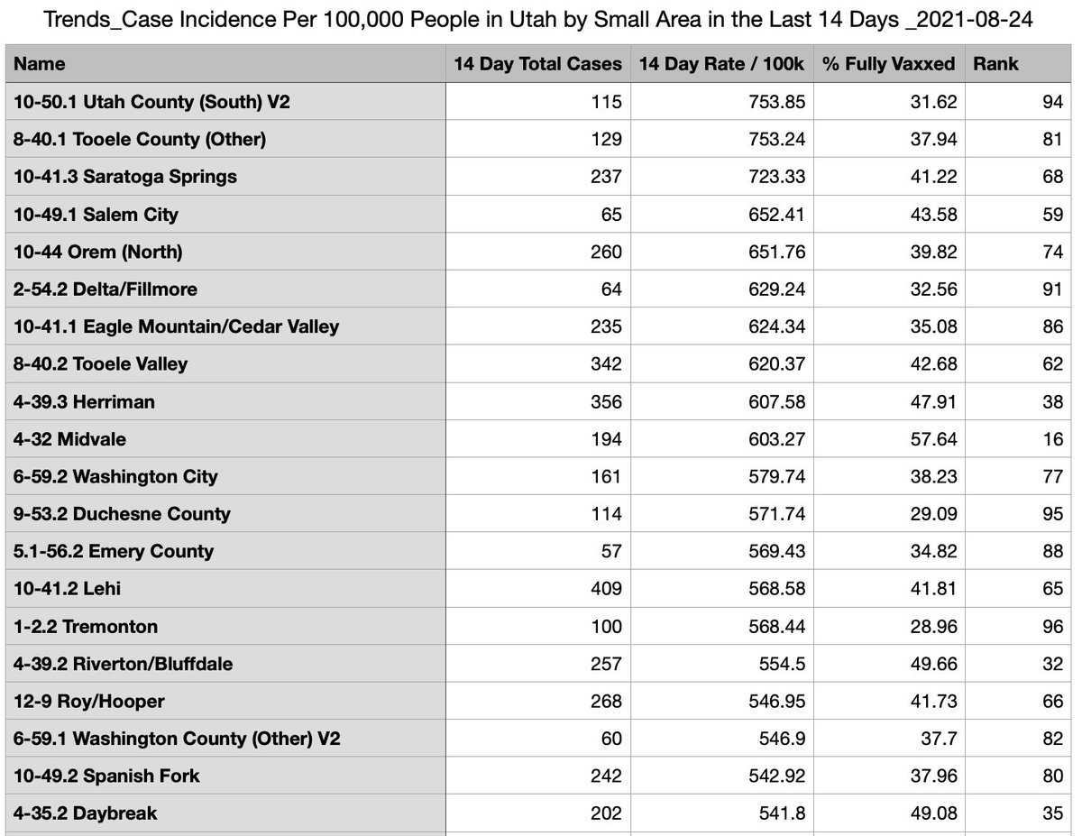 For 14-day infection rates, So. Utah County neck-and-neck with Tooele. Here are Top 20 & Bottom 20 w/ vax rates. Interesting outliers in both (Midvale, Provo/BYU, etc.). #utpol