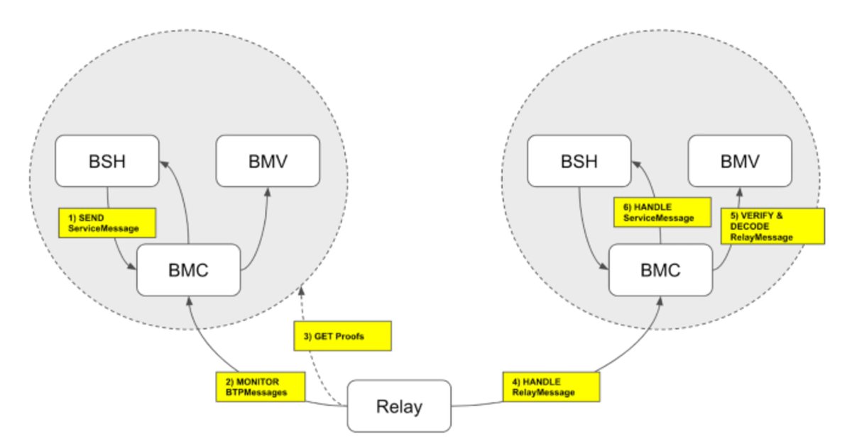 The 👂BSH passes the data to the 💳BMC, which then reads the BTP data, verifies it and passes it to $ICX Relay (Relay = application operating independent of blockchains). This $ICX relay seems to float in between the blockchains that are communicating with eachother.