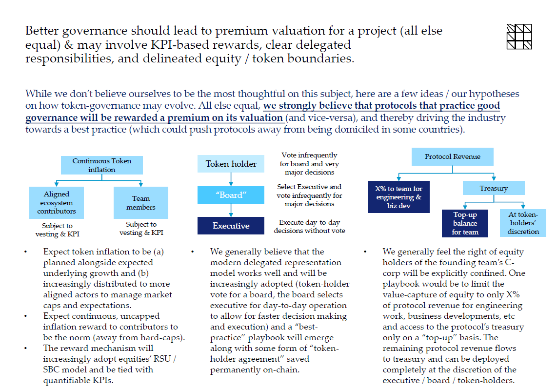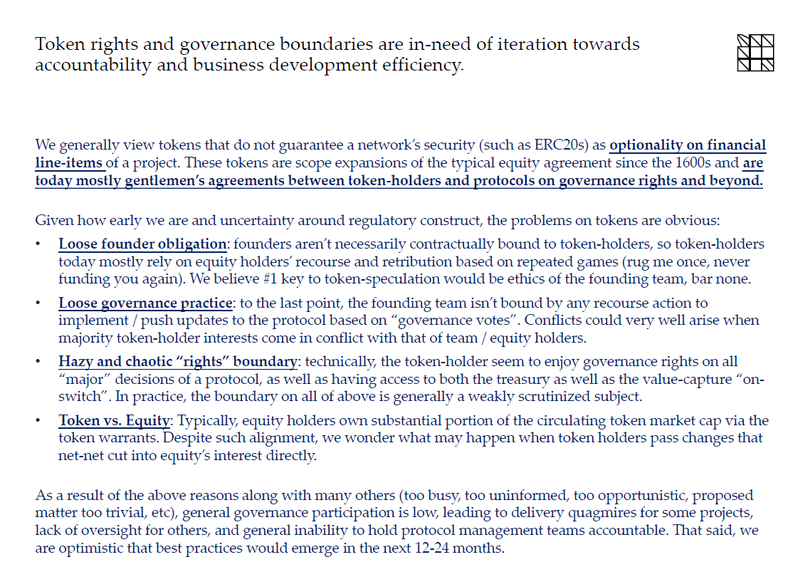 (14) …but token-econ don’t matter if founding team isn’t “ethical”. Tokens today are gentlemen’s agreements & optionality on protocol line-items. We are generally bullish on token-gov evolution (akin to equity corp-gov playbook). Tokens w/ good token-gov should deserve a premium