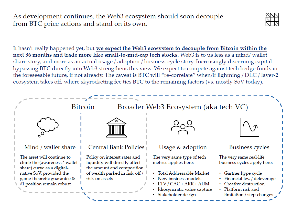 (2) As Web3 evolves, its drivers, narratives, and price correlation will all decouple from BTC. The 0-to-1 moment likely already occurred – and we are entering the 1-to-N phase where infrastructure & applications recursively improve one another.