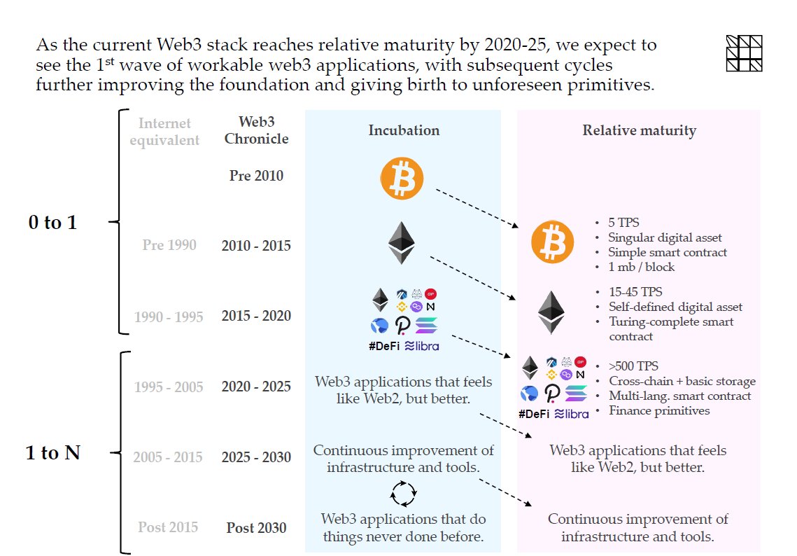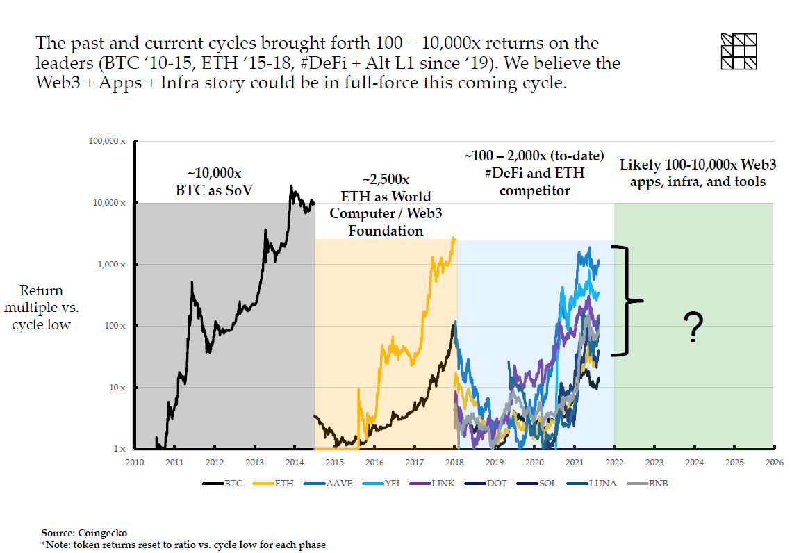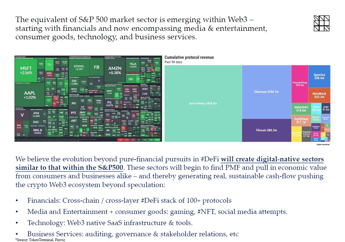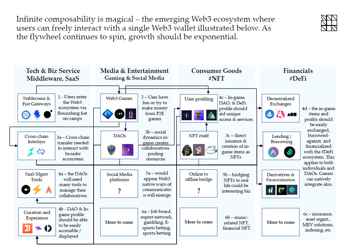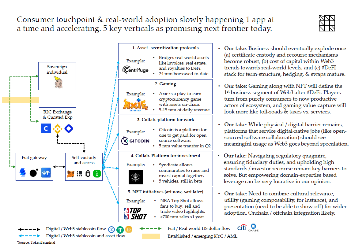 (3) Since late 2020, the Web3 ecosystem saw explosive DeFi primitives, better infra / data / tools, and finally real attempts at business applications beyond just speculation – in particular around asset securitization, gaming, collab. platforms, and NFTs.