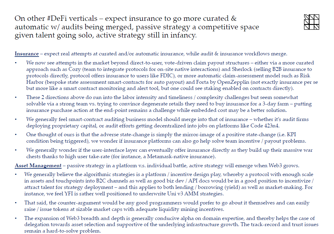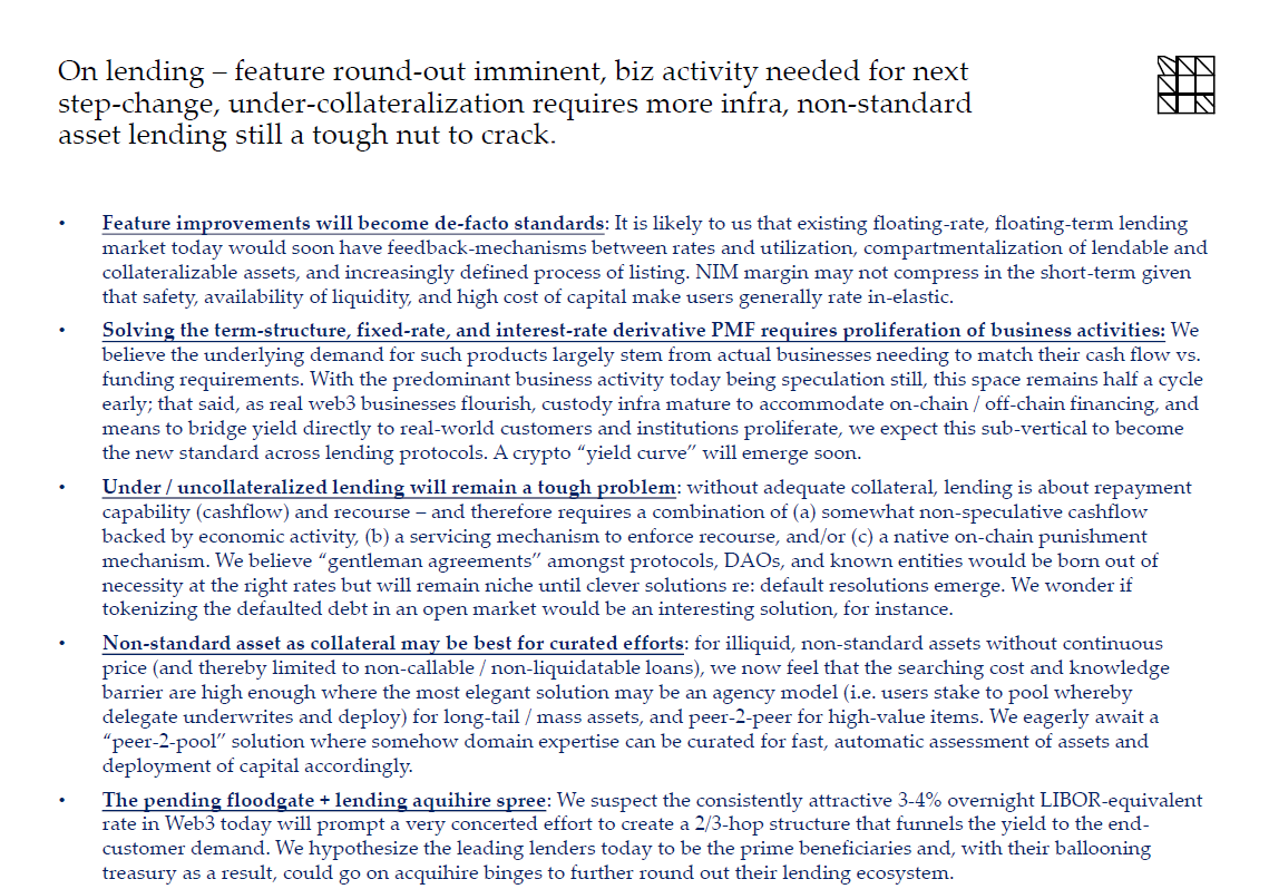 (6) On lending, we think the solid incremental features would be imminent across protocols, but the broader feature sets would require real economic activities atop to take hold. Undercollateralized and non-standard asset lending may remain niche for now.