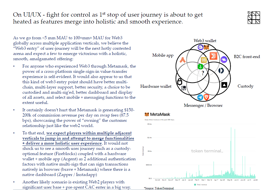 (7) On UI/UX, we feel that the 6 key verticals that face the users everyday could merge into a more holistic and smooth experience. Metamask’s 75 mm+ revenue proves that owning the user is still an amazing way to monetize and it’s their game to lose.