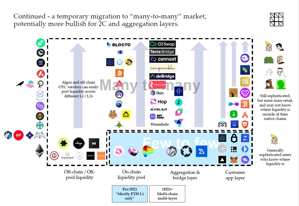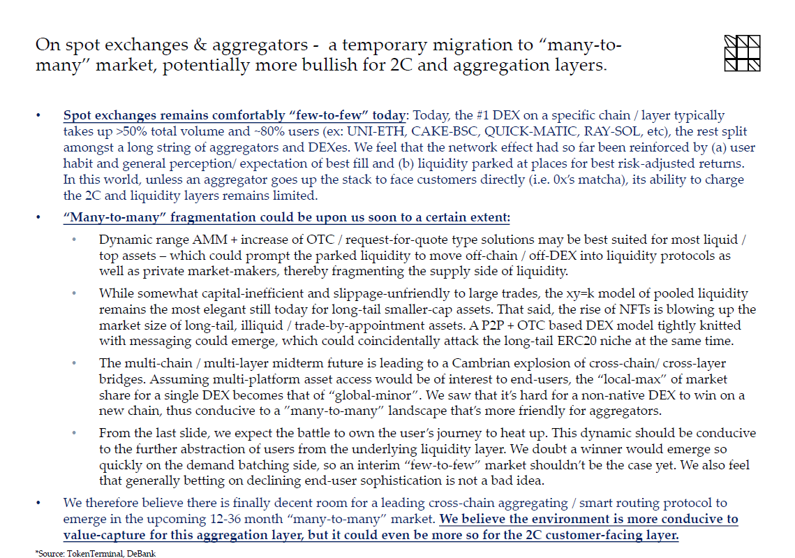 (8) On DEX & aggregators, the MLMC future along with liquidity moving to off-pool / RFQ and the 2C app becoming more segregated as # of users explode is quite conducive to a temporary “many-to-many” market structure which helps 2C apps and aggregators.