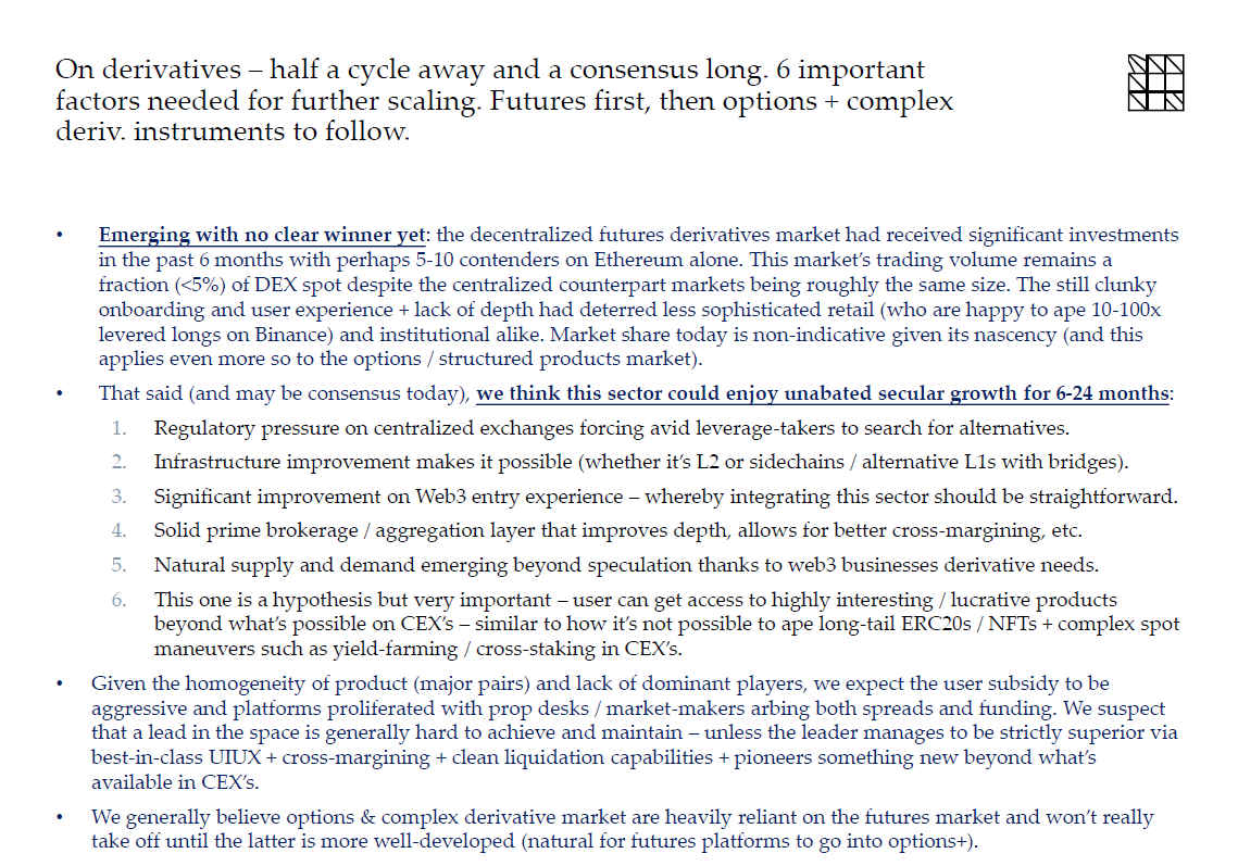 (9) On derivatives, we generally buy into the 6–24-month secular growth story. Although a clear winner hasn’t emerged yet. We think cross-margining + pioneering solid new products (like @DavidWhite ‘s everlasting option) is how this space really eclipses its CEX counterparts.